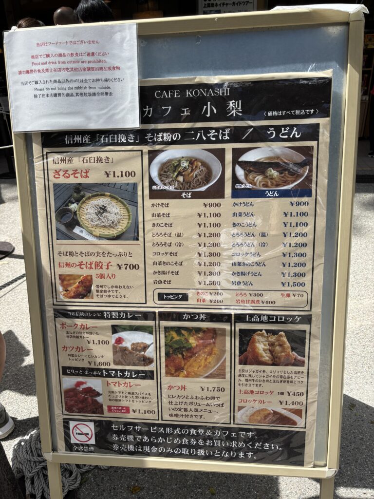 河童橋まで戻ると2時前。 朝食が遅かったものの、さすがにおなかはペコペコです。