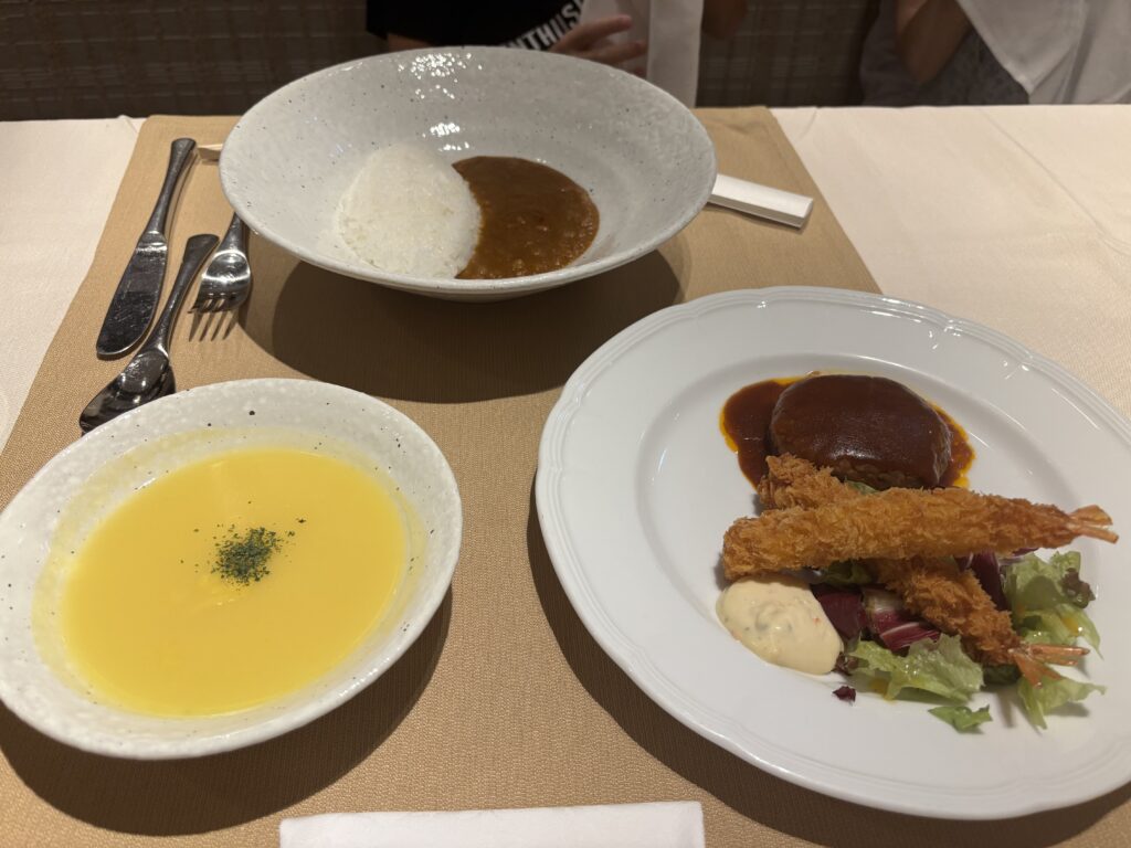子ども用のカレーとハンバーグ、エビフライ、コーンスープ。