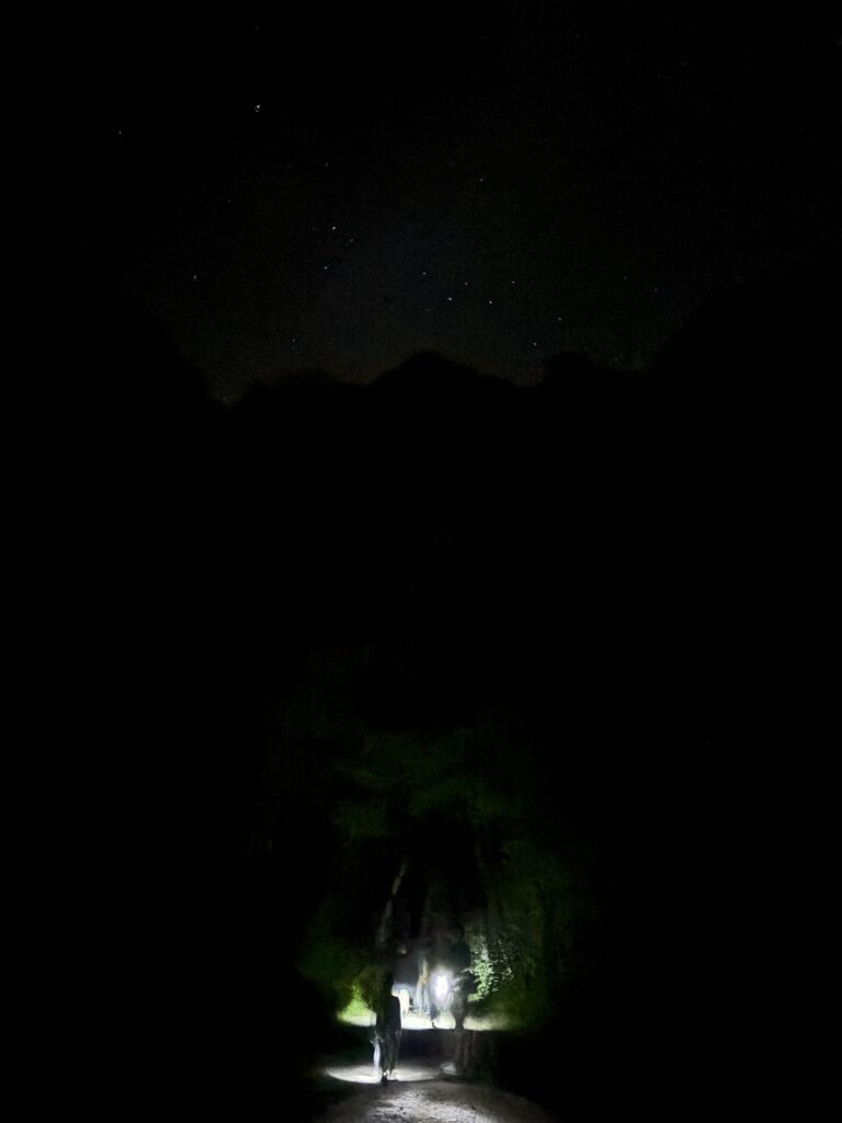 懐中電灯を片手に暗い道を歩くと、広い河原に到着。