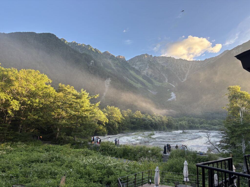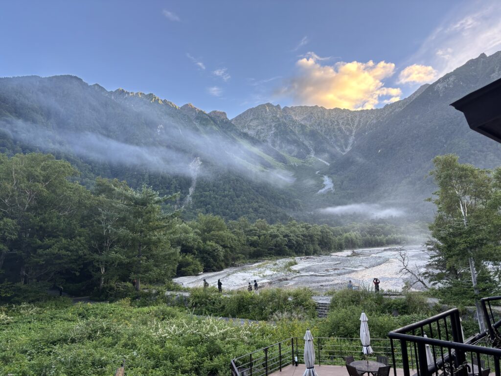 穂高連峰と梓川の流れを正面に望む最高のロケーションで、朝の光に包まれる山々や、夕暮れに染まる空のグラデーションは言葉にならないほどの美しさでした。