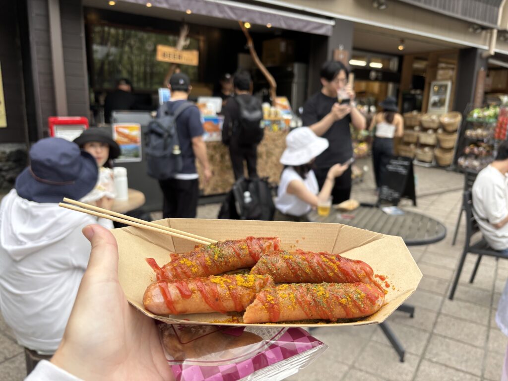 順番待ちの間、「KAMIKOHCHI BEER STAND」でソーセージとたい焼きをテイクアウト。ここだけは空いていて、すぐに買うことができました。歩き疲れた体にぴったりで、とても美味しかったです。
