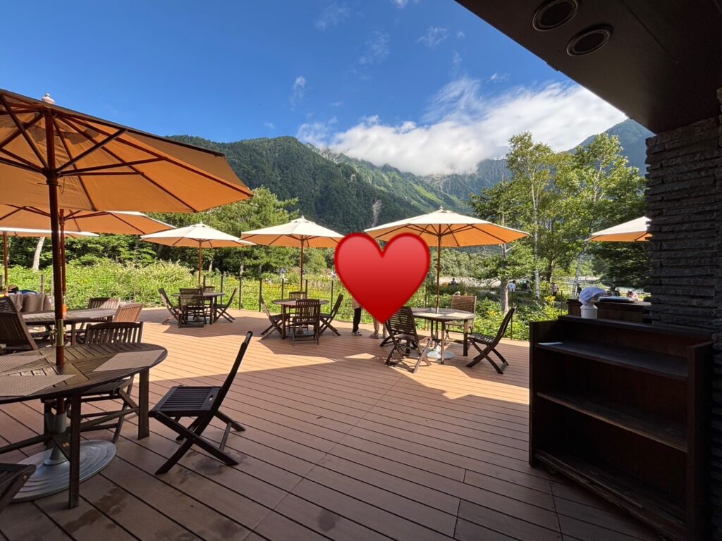 テラス席からは穂高連峰を一望できる絶景の宿で、上高地について調べ始めた時から「いつかここに泊まりたい!」と思っていた憧れのホテルでした。念願叶っての宿泊です✨