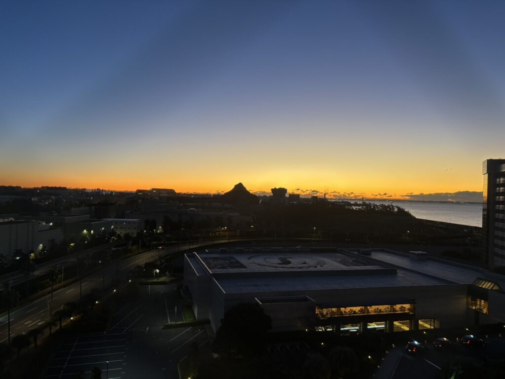 朝、開園前のパーク方面。海も見えます。